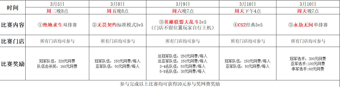 ★比赛奖励:参与奖网费10元,单场赛冠军选手获得300元网费奖励,亚军选手获得100元网费奖励,季军选手获得60元网费奖励。
