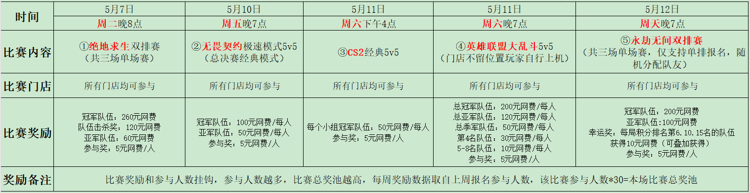 ★比赛奖励:参与奖网费5元,冠军队伍每人获得100元网费奖励,亚军队伍每人获得50元网费奖励。