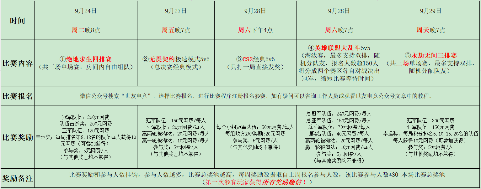 ★比赛奖励:参与奖网费5元,冠军队伍获得360元网费奖励,击杀奖队伍获得200元网费奖励 ,亚军队伍获得120元网费奖励。幸运奖队伍每人获得10元网费奖励(幸运奖可叠加获得)