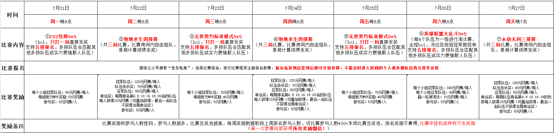每局冠军队伍:100元网费/每人