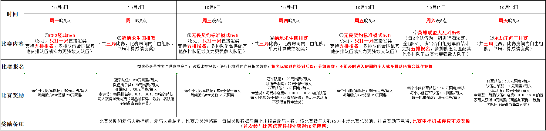 每局冠军队伍:100元网费/每人