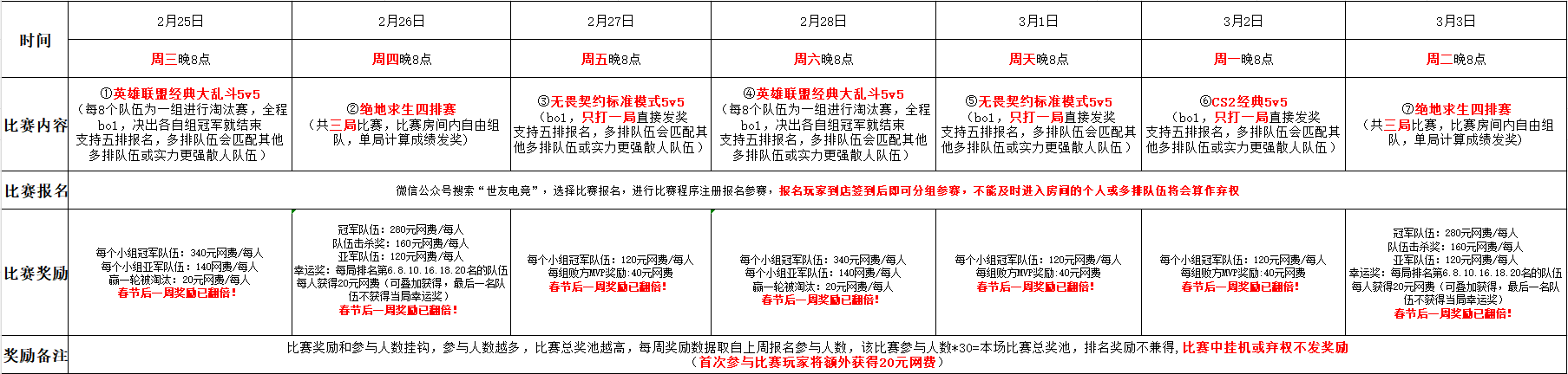 自2月9日(周一)至2月24日(周二),为欢度新春佳节,世友比赛将暂停举办。年后,我们将于2月25日(周三)恢复正常比赛日程,为回馈大家过去一年对世友电竞及世友赛事的支持与厚爱,2月25日(周三)至3月3日(周二)期间举办的7场比赛奖励翻倍! 在此,我们提前祝大家新春愉快,阖家幸福,万事如意!